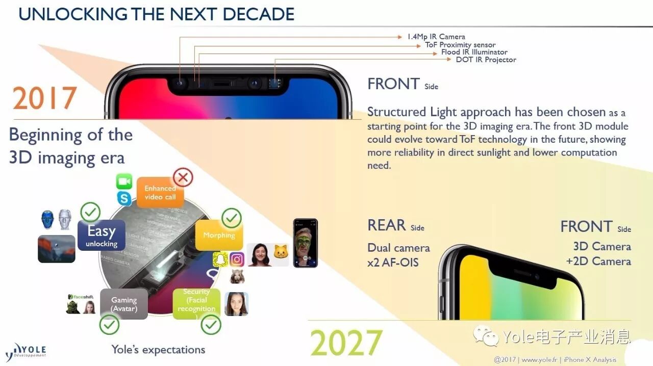 正如大家所言,这只是一个新时代的开始,但是苹果已经示范了如何使用其人工智能软件和硬件来克服3D相机的许多既存缺点。结构光(structuredlight)的限制来自加速处理器APU所需处理的运算量及其在处理阳光时可能遇到的困难。由于3D摄像机并非时时刻刻都在搜寻脸孔,所以添加一个小型的飞行时间测距ToF探测器来告诉它何时该被唤醒/启动(wake up)成为关键。下一步应该会是全ToF数组摄像机。根据Yole所发布的技术路线图,应该在2020年之前发生。2017年已经成为iPhone在3D和扩增实境AR的重要年份,但AI还是最重要的主轴。在经过几年规格竞赛的竞争之后,苹果终于重拾据以闻名的天才名声。在iPhone推出十年之际,苹果终于能够将史蒂夫·乔布斯的精神重新带回到一个高价而有吸引力的产品。