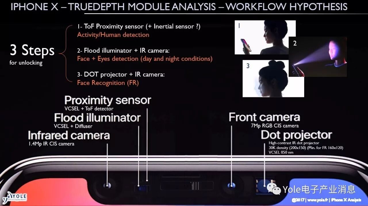 是的,苹果做到了。成功的将3D相机装置在iPhone X的正面,而且采用的技术方法比任何人的预想都还复杂。这不是我们所猜想的飞时测距(time-of-flight ,ToF)数组,而是一组飞时测距传感器和红外线“结构光”相机的结合,何者能使用匀速的“泛光(flow)”或“光点(dot pattern)”照明。透过此法的采用,苹果正在进行一场消费电子用户接口的革命。此举带来的深远影响,将远超过智能型手机的市场范畴。 Tim Cook在iPhone X的新品发表秀一开始就提及,这只是一个新领域的开始。正如Yole Développement在3D影像和感应测技术报告 3D Imaging and Sensing所预测的,这是3D相机市场的发展的开端,而整体市场规模预估将于2022年增长至$ 60亿美元。