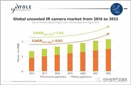 Uncooled IR imaging market has been initially driven by defense applications. Then innovation and cost reduction enabled the implementation of a new commercial market segment including thermography, surveillance, PVS and more applications. Today the uncooled IR camera market is showing an 8% CAGR between 2016 and 2022 reaching almost US$ 4.4 billion at the end of the period. Only few players control this industry: in 2016, two leading companies, FLIR and ULIS, both with different market strategies and solutions, owned more than 75% of the total market (in volume).
